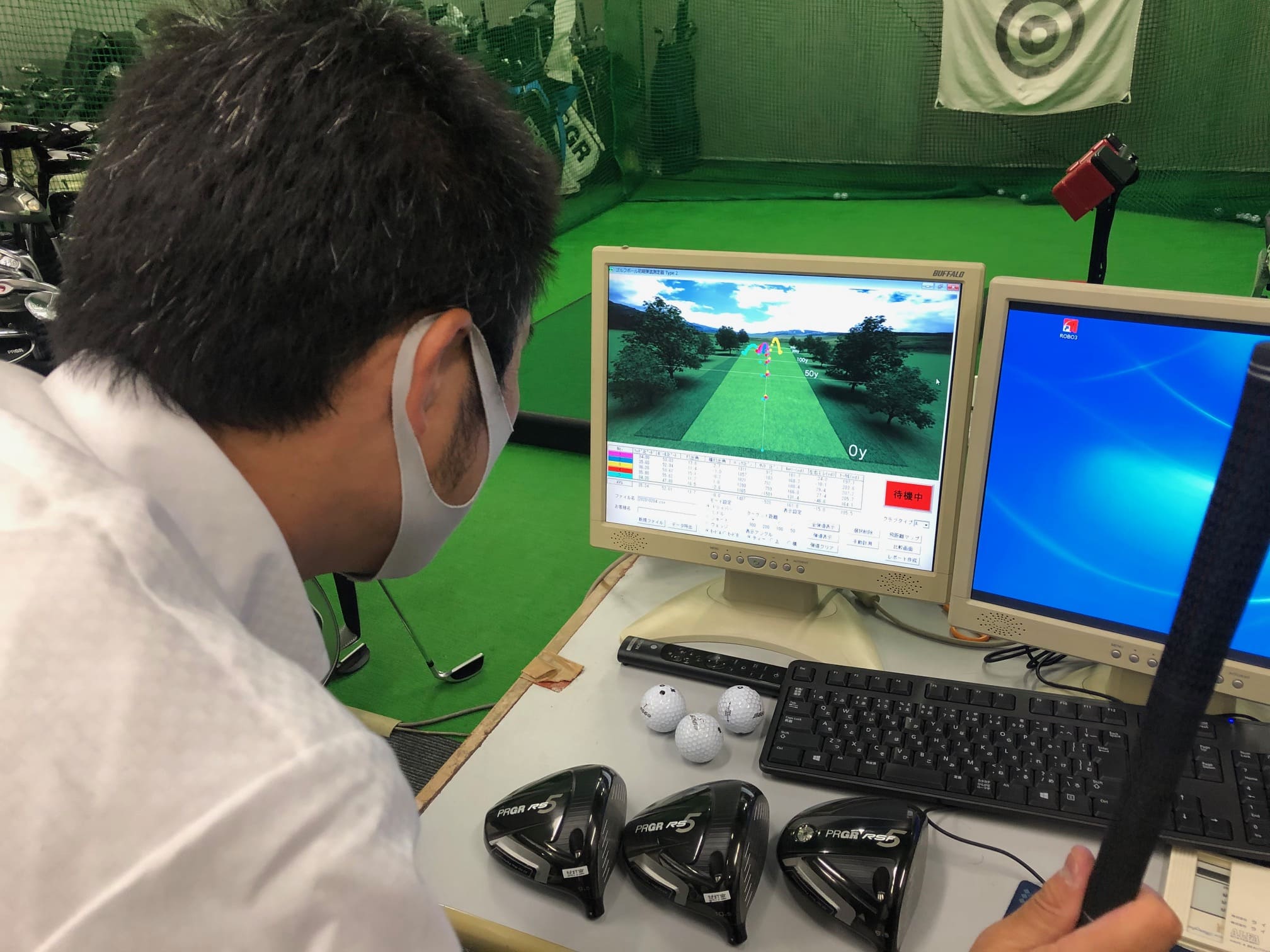 『(俺も含めて)ほとんどのアマチュアゴルファーが手打ちだからいいんだよ。そのアマチュアのスイングで最高の結果が出るようにPRGR企画開発スタッフが日夜研究して生まれたのがこれらのクラブなんだから。とりあえず今日は、それぞれのクラブがどれくらい飛ぶのか。どっちに飛んでいくのかを弾道測定器で確認しよう。』