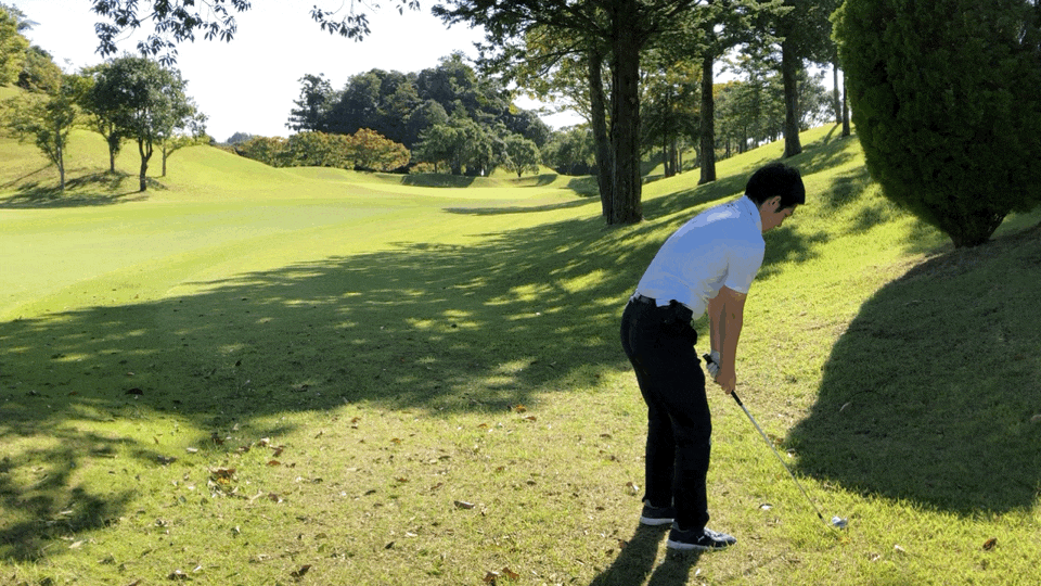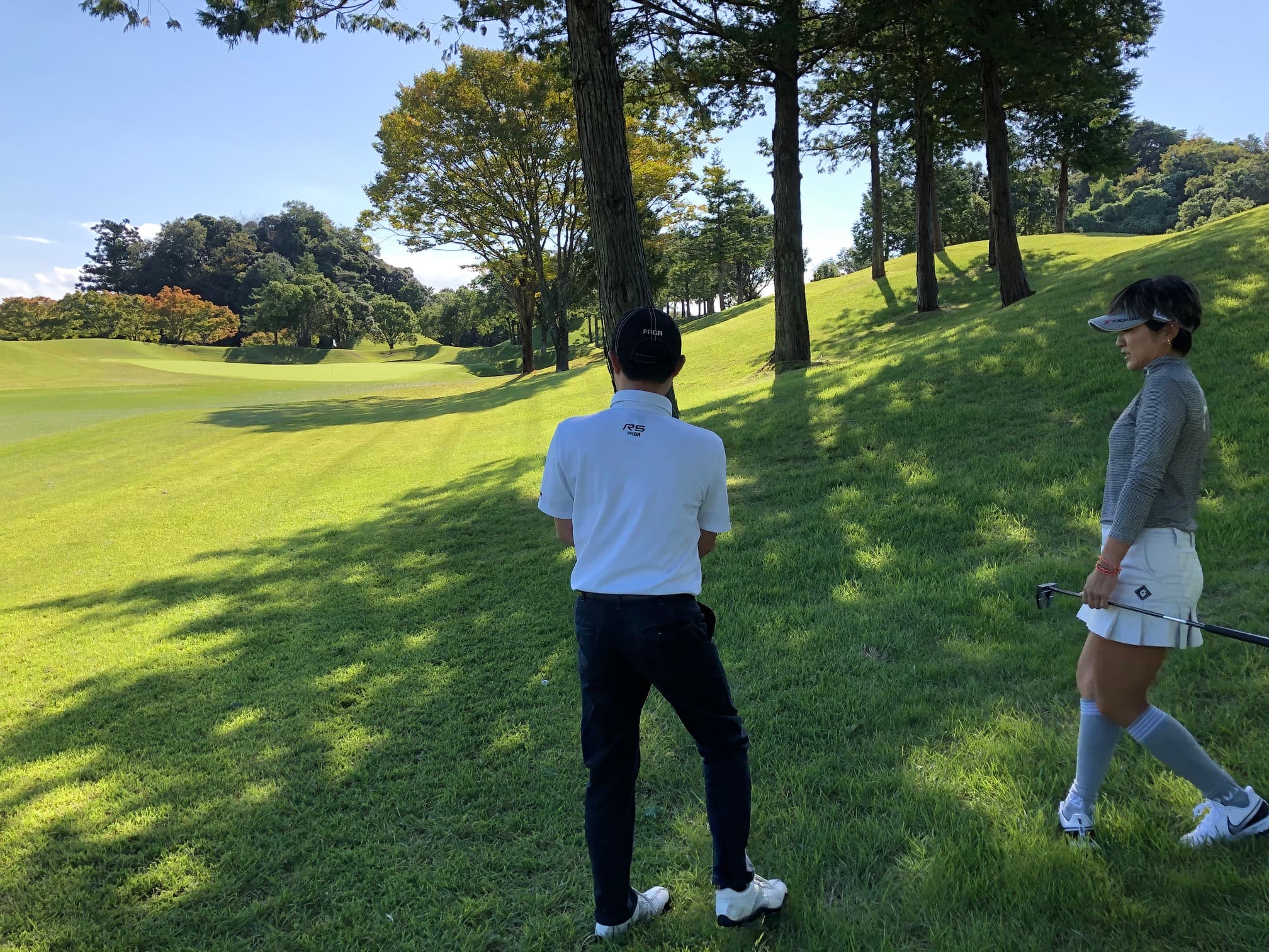 ただしこれもU君と同じく目の前の木が邪魔になるつま先あがりのライ。初心者ゴルファーはどう打つのでしょうか。