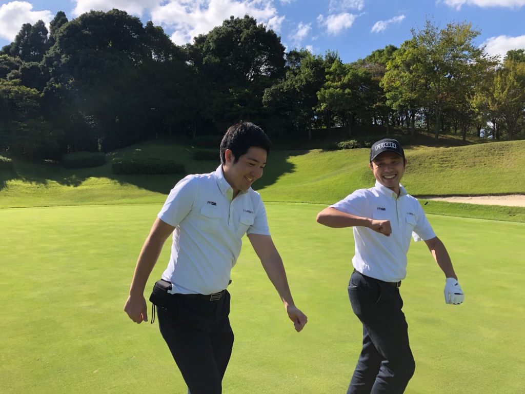 今回のゲストはTEAM PRGR藤本麻子プロ。サイエンスフィット日記メンバーのエリートゴルファーU君(右)と初心者ゴルファーT君(左)が真剣勝負でプロに挑みます。