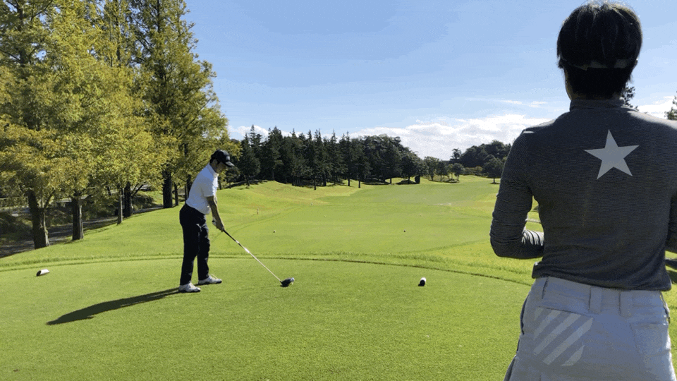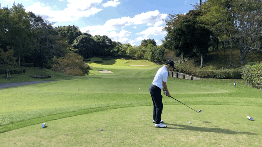 コムタンの教えを忠実に守り、いつもよりやや力が抜けたスイングから放たれたショットは何とフェアウェイをキープ!推定飛距離は185ヤードです。