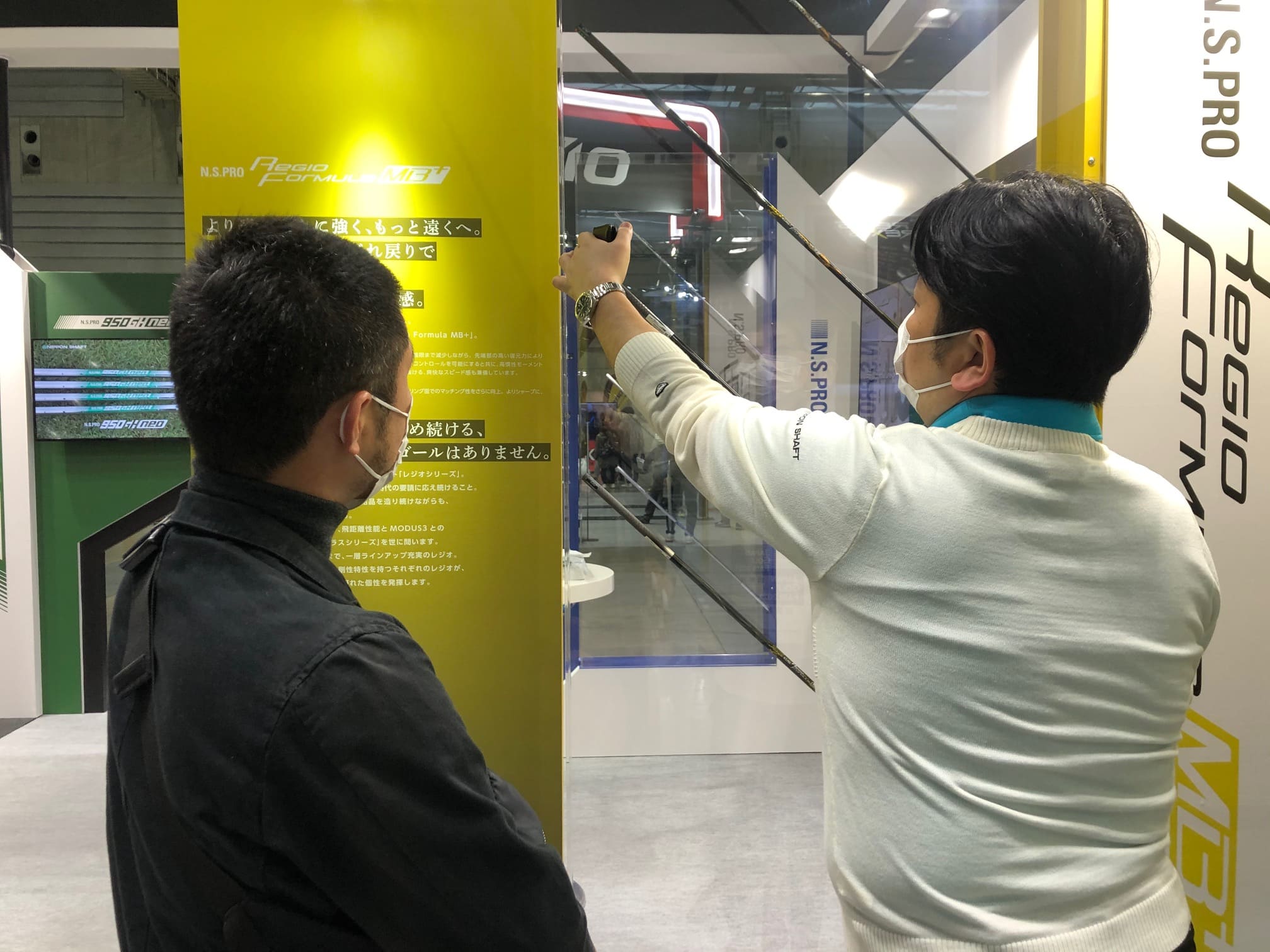 『今年の1月に発売したRegio FORMURA MB+は全長7軸、手元には9軸組布を配置した合計16軸設計で、手元でしなりながらも先端の強烈なしなり戻りでスピード感も得られる、安定感と飛びを両立するシャフトです。』