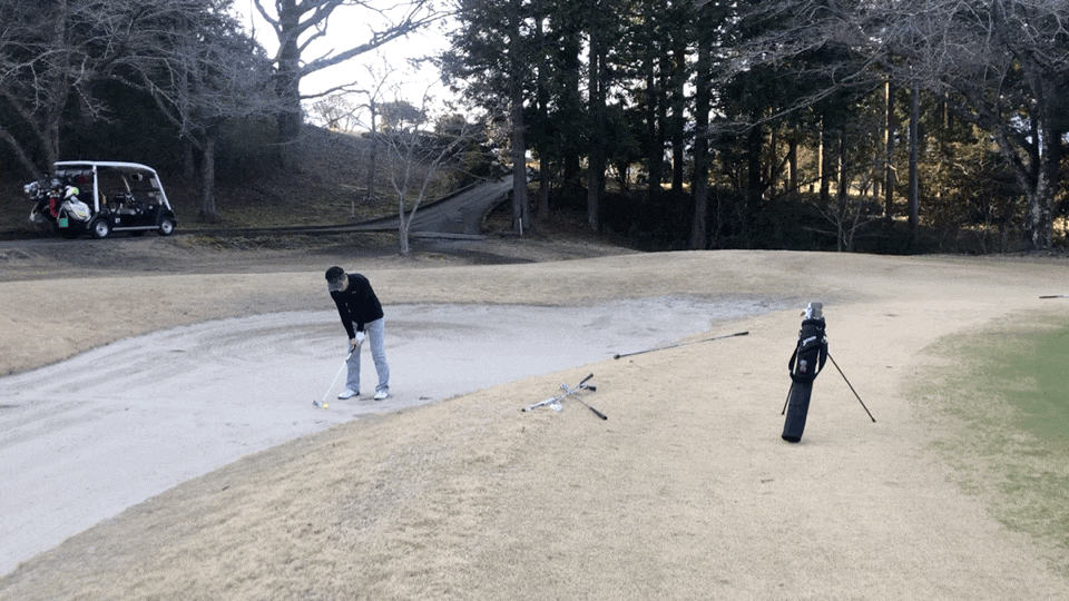 Nさんのバンカー均し、左手の角度最高です(笑)