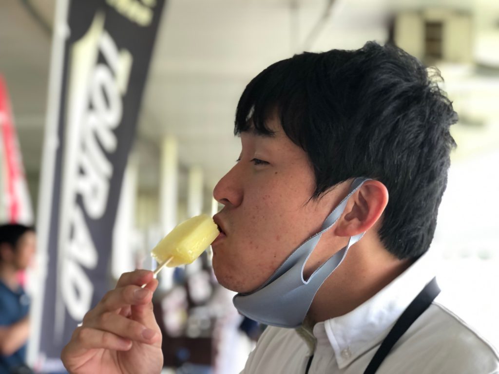※試打会中に差し入れいただいたアイスを頬張るE君。