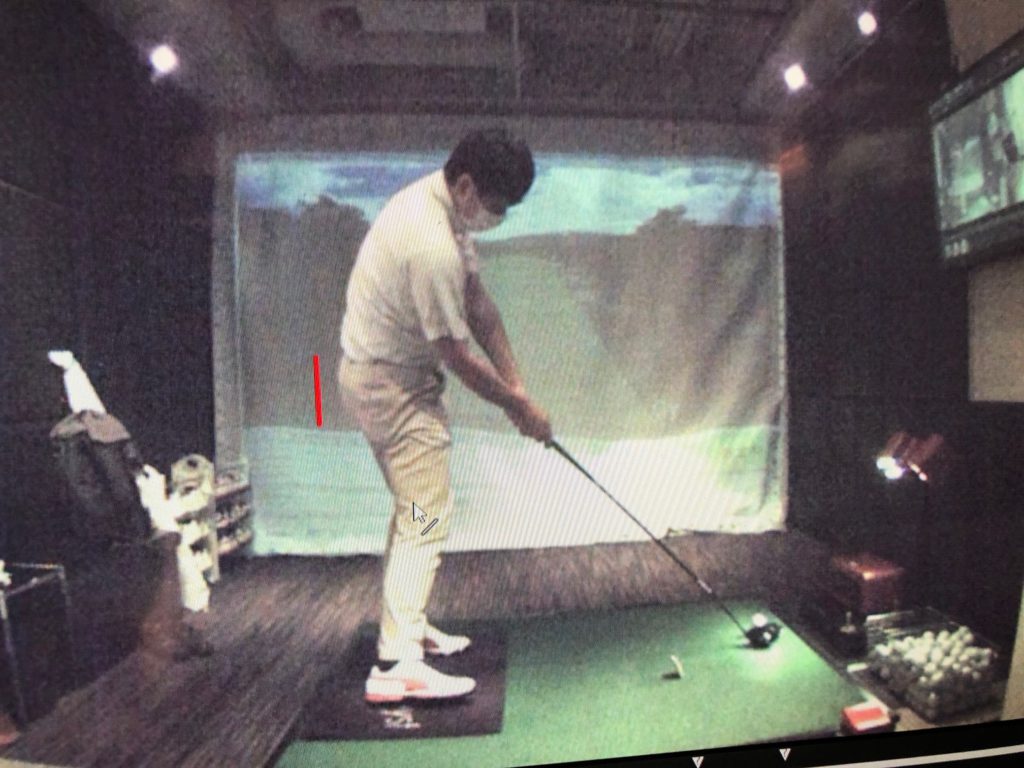 たしかに動画で確認するとアドレス時(赤い線)よりインパクトで腰が前に起き上がっています。