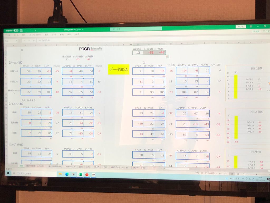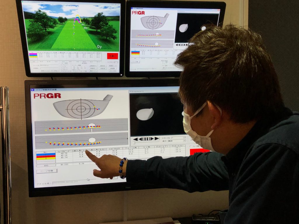 いつの間にかのPRGR GINZA EXの京村店長もやってきて、興味深くF君のスイングデータを見つめています。