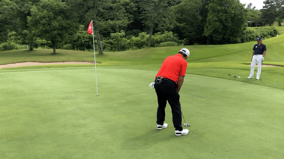 動かない手で必死に長尺パターを振るY選手。長尺パターはトップレベルのおじさん選手界隈での使用率高めです。