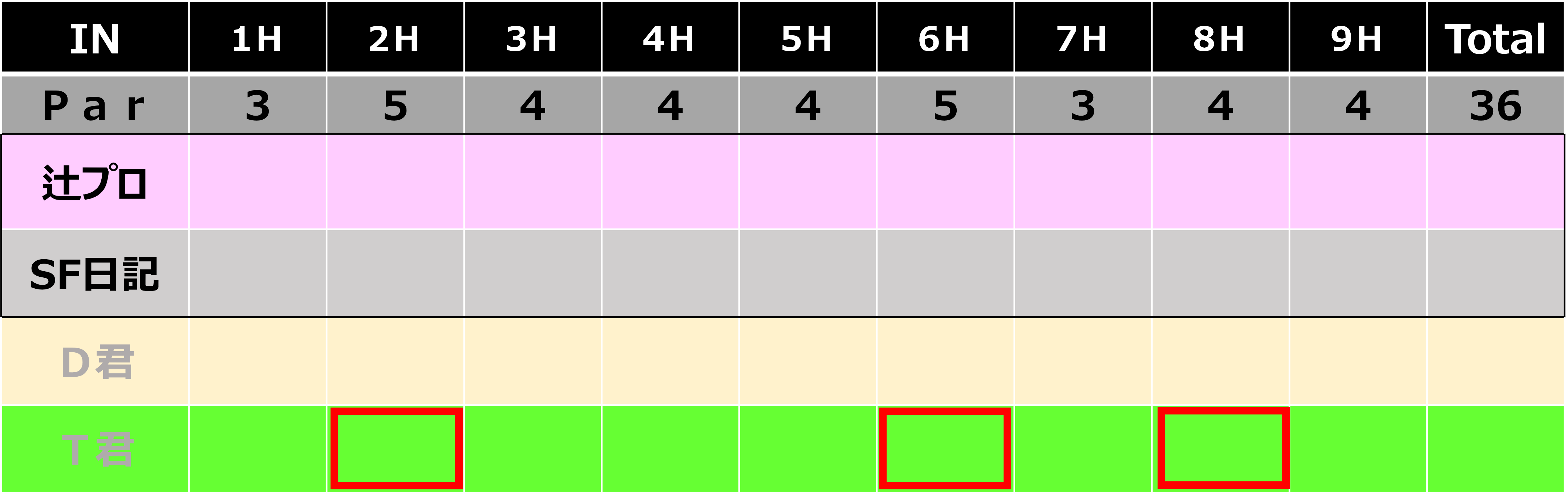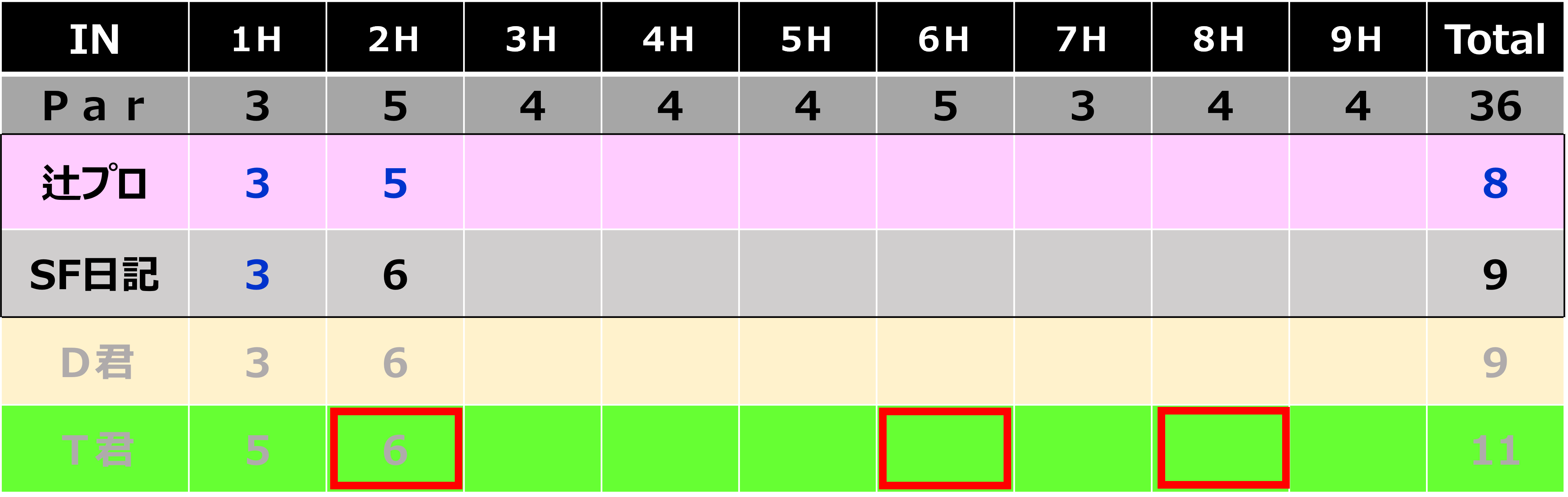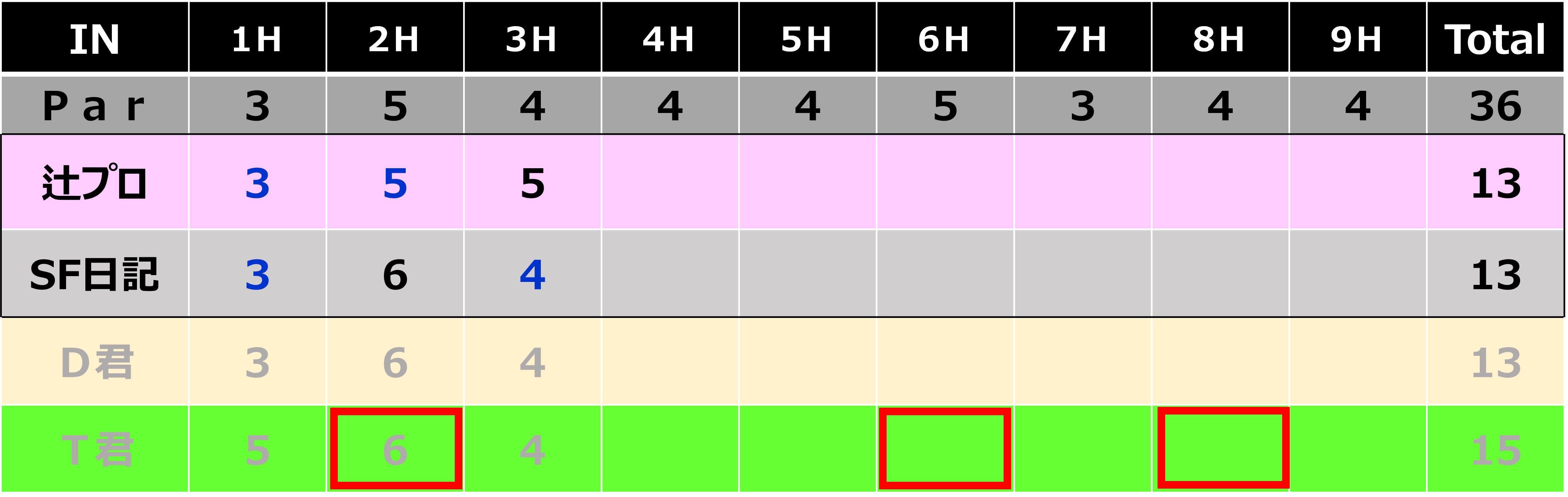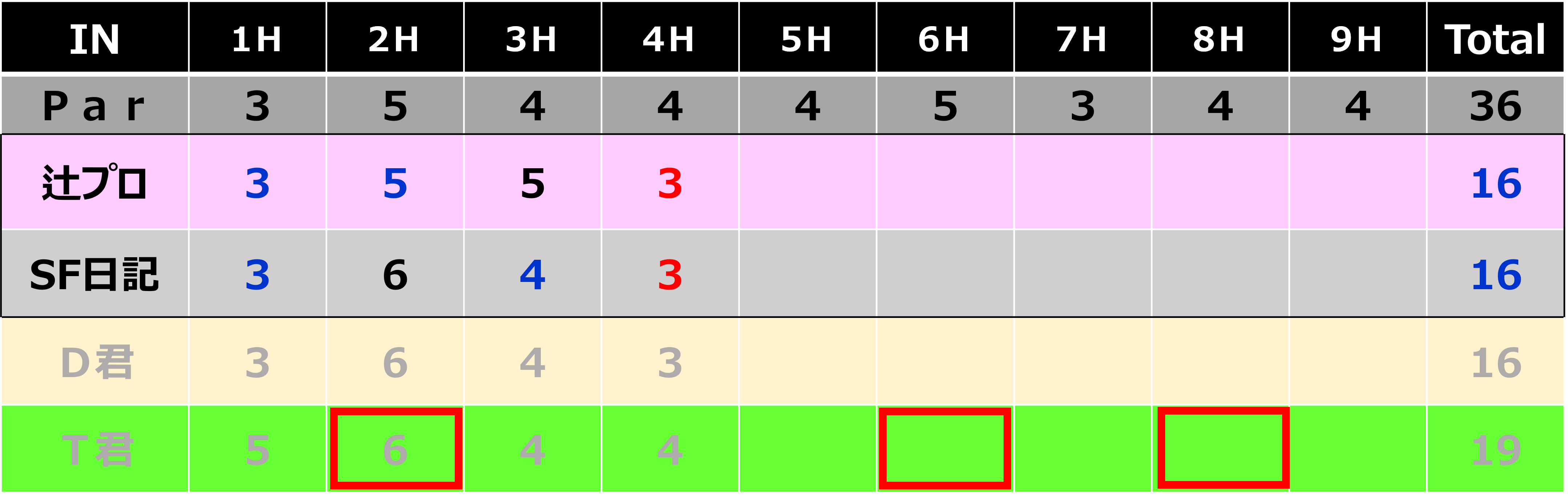 このホールは辻プロがパー、サイエンスフィット日記チームはT君のハンデを生かせずふたりともボギーで、辻プロの1打リードとなりました。