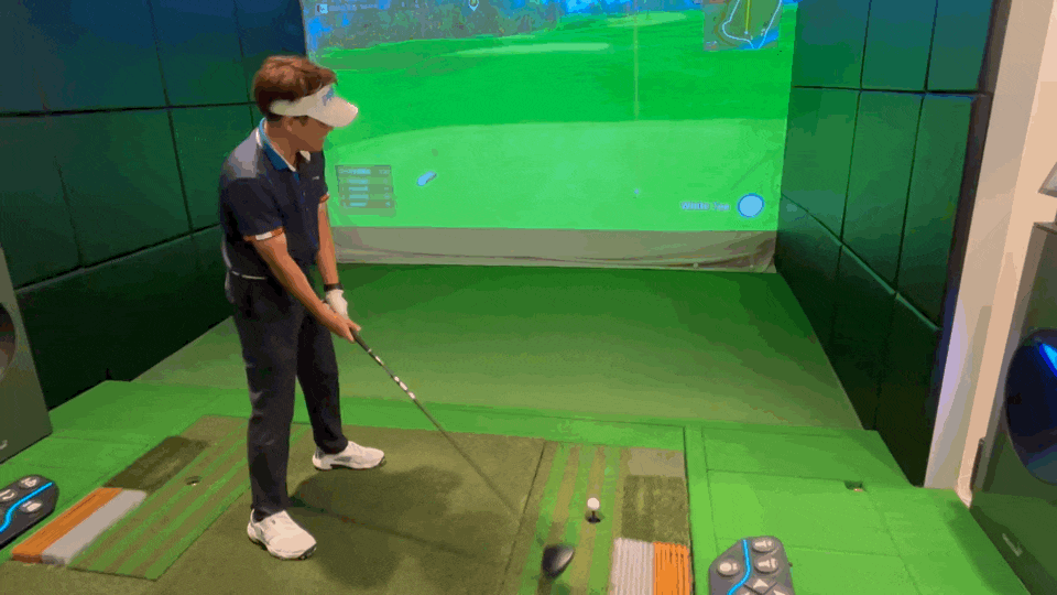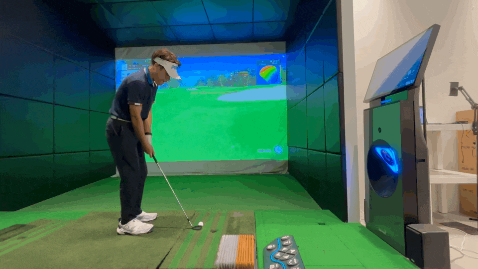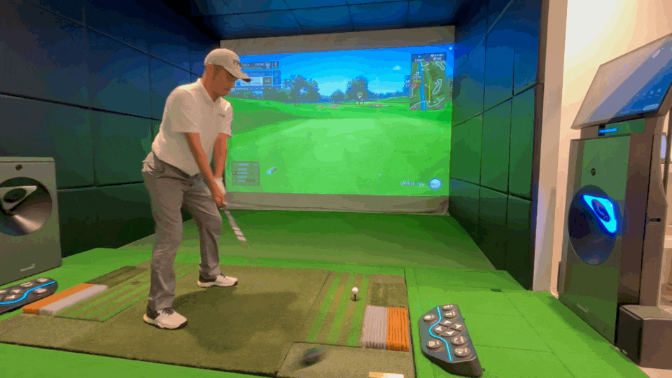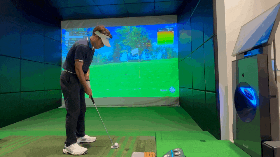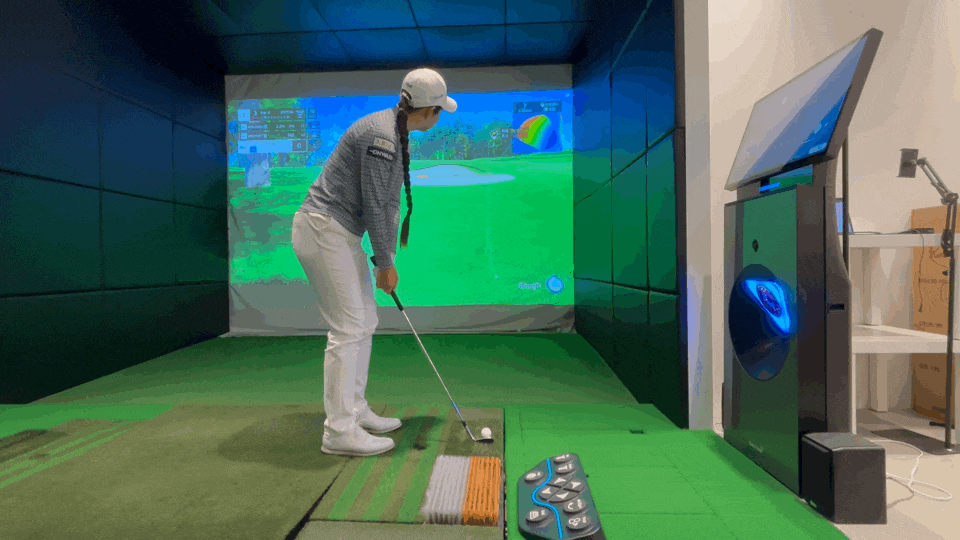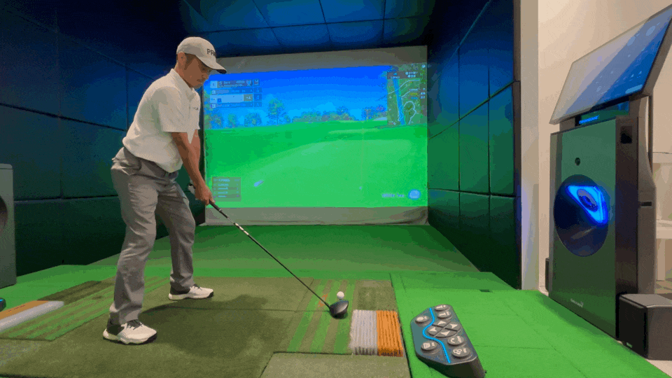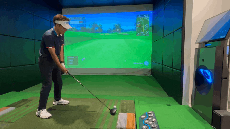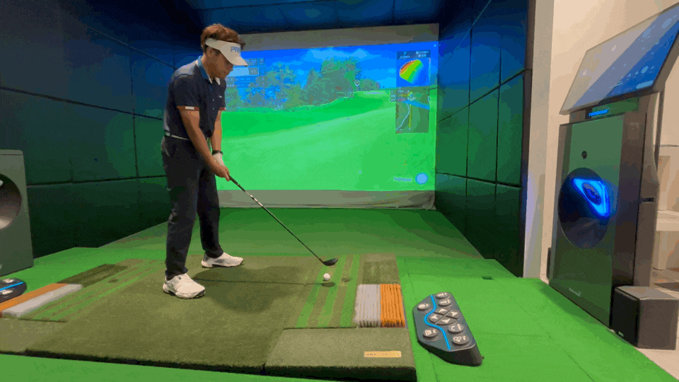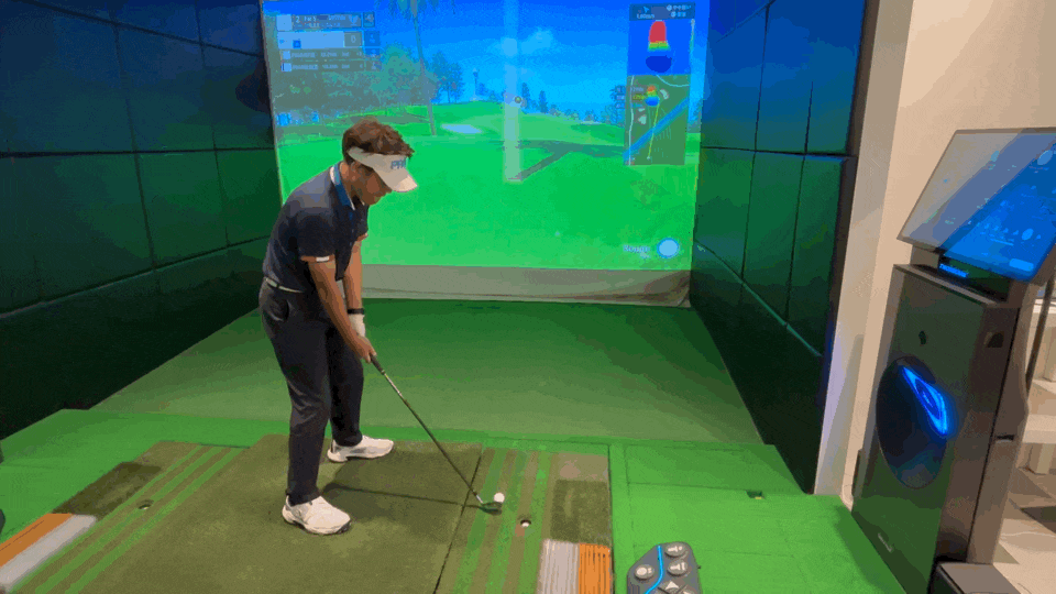 使用するシミュレーターは、世界的ゴルフシミュレーターメーカーゴルフゾンの最新機器TWOVISION NX。リアルなグラフィックと弾道再現性で最高の没入感を体感できます。決戦の舞台はD君が一度は回ってみたいと熱望した川奈ホテルゴルフコース富士コースを選択。トーナメントコースとして数々のドラマを生んできたインコースを戦います。風の強さなどの難易度とOKパットを1.5メールに設定し、準備完了。