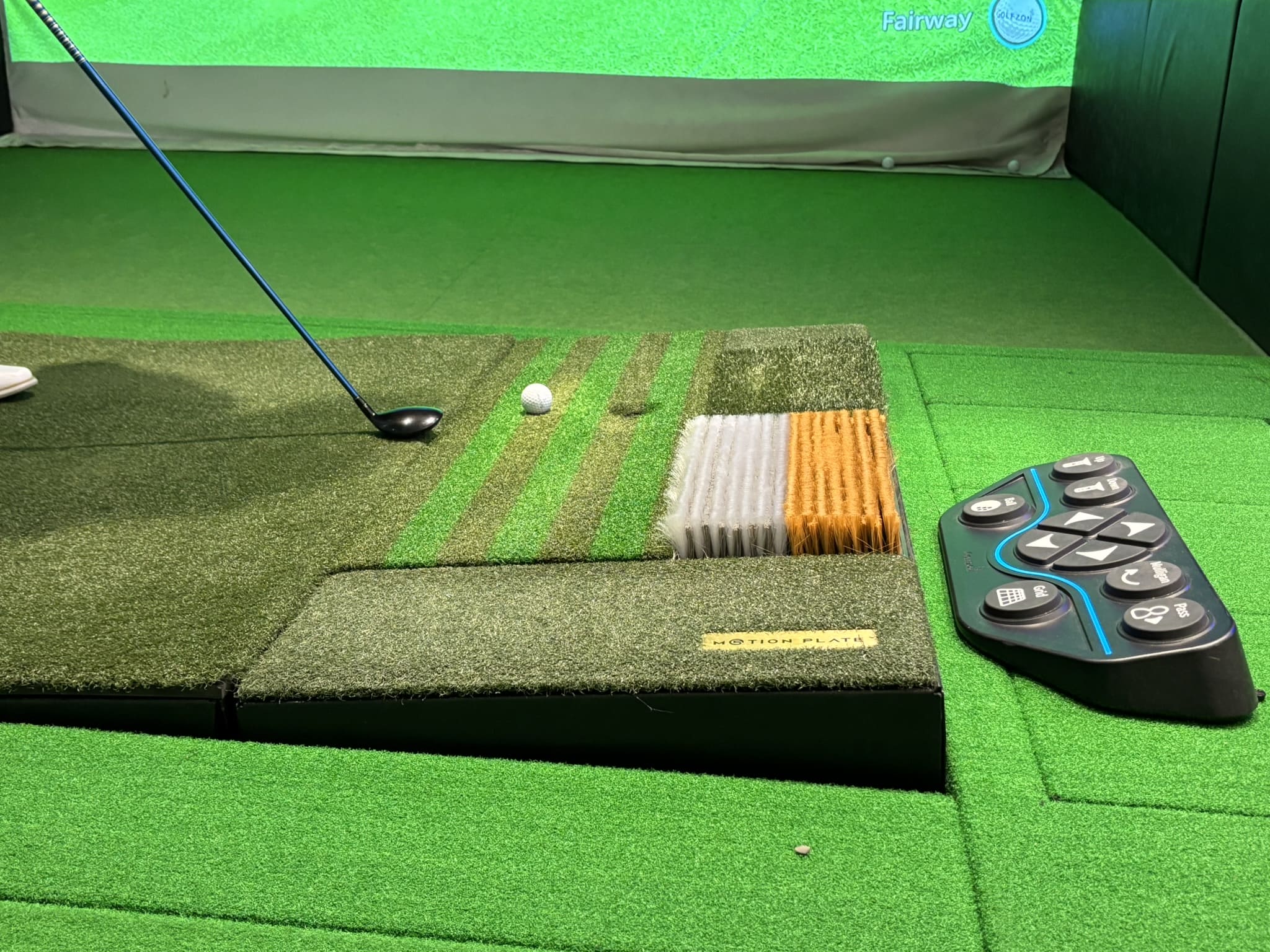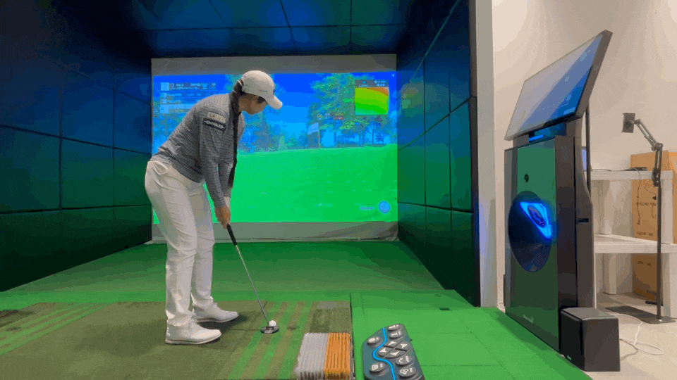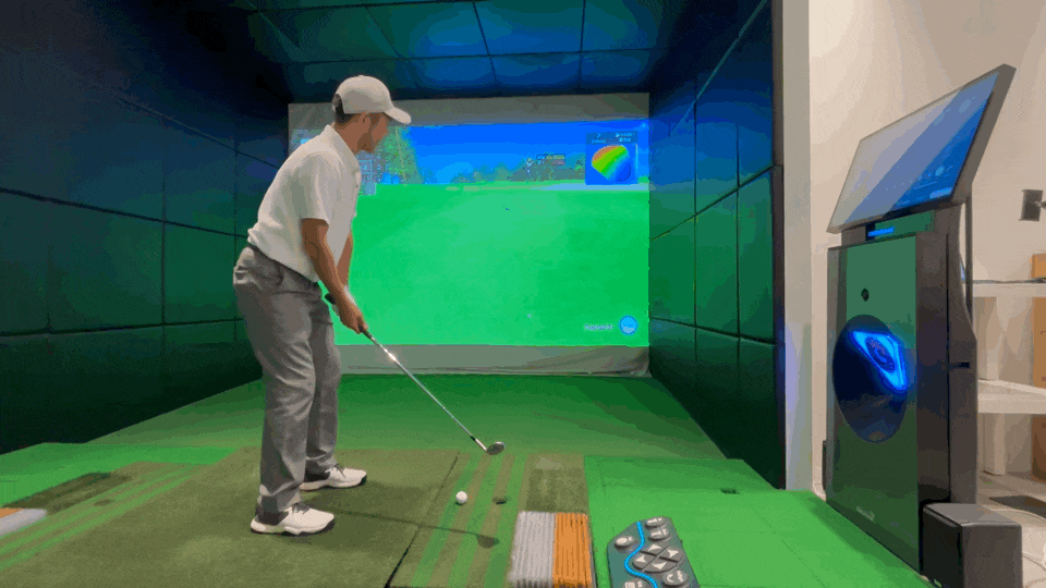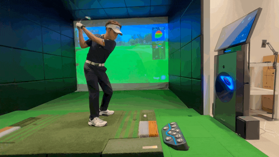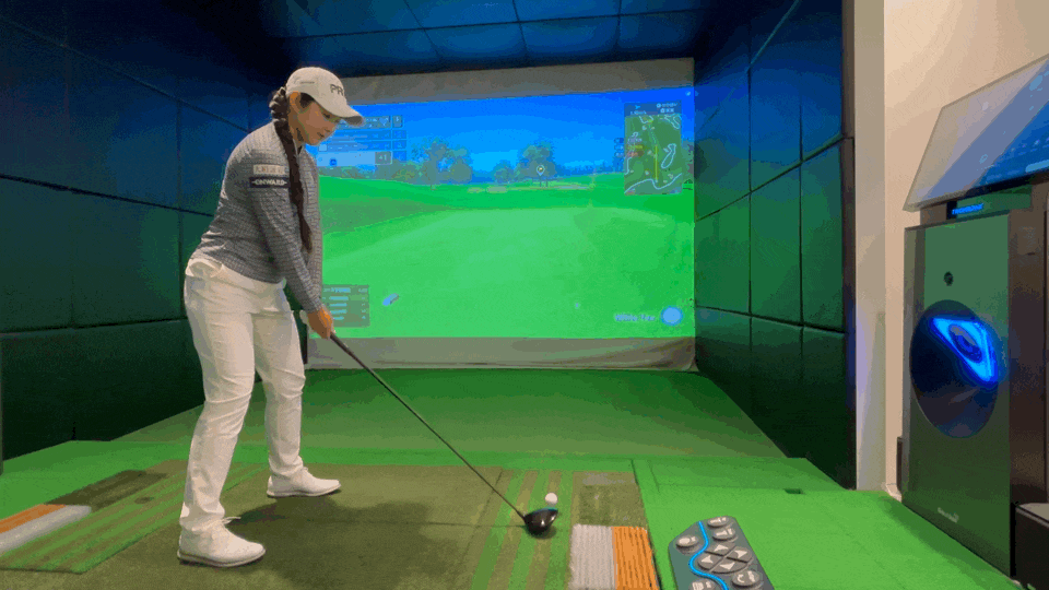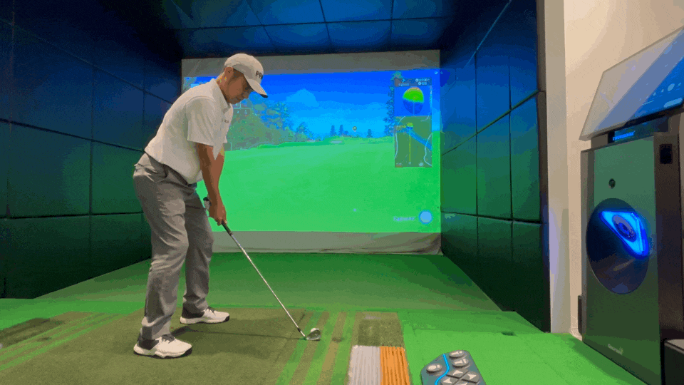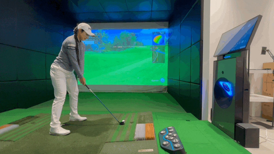 使用するシミュレーターは、世界的ゴルフシミュレーターメーカーゴルフゾンの最新機器TWOVISION NX。リアルなグラフィックと弾道再現性で最高の没入感を体感できます。決戦の舞台はD君が一度は回ってみたいと熱望した川奈ホテルゴルフコース富士コースを選択。トーナメントコースとして数々のドラマを生んできたインコースを戦います。風の強さなどの難易度とOKパットを1.5メールに設定し、準備完了。