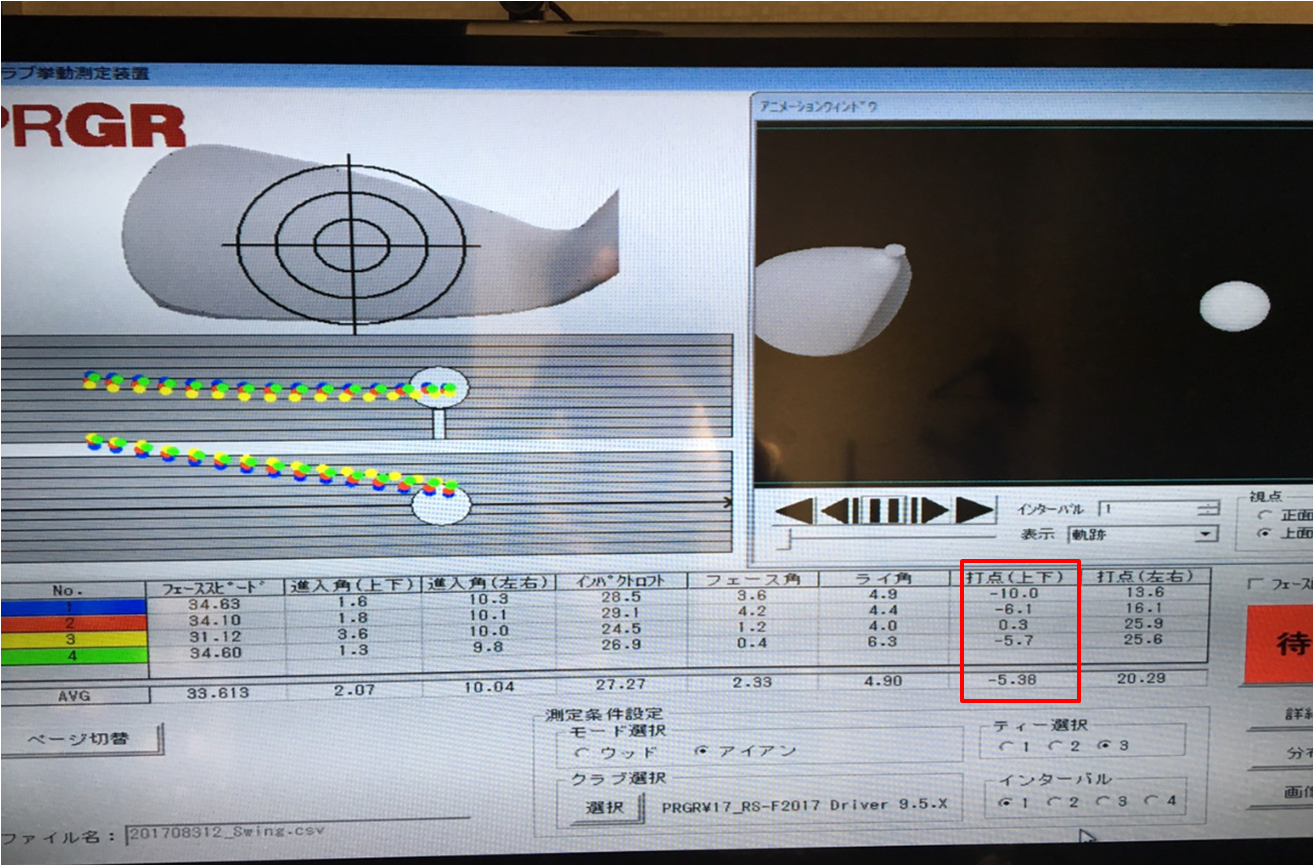 PRGRオリジナルのインパクト直前のヘッド挙動測定器【RED EYES ROBO1】で確認しても、しっかりダウンブローに打ててます。