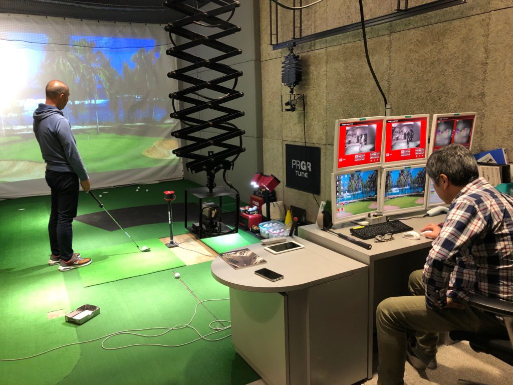PRGR GINZA EXの店長である京村店長が、わざわざ電車で40分離れたここまで来るということはよほどのことなのでしょう。ちなみに、PRGR TOKYO-HUBは、PRGR直営店で唯一ショートゲーム解析をおこなっておりますので、アプローチを科学的に測定できる解析器を設置しているのです。
