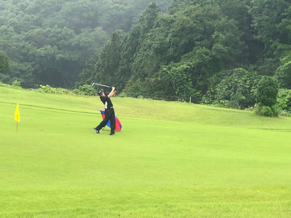 雨の中の難しいコンディションに同伴競技者が苦労するなか、K君は安定したプレーでハーフを折り返しました。