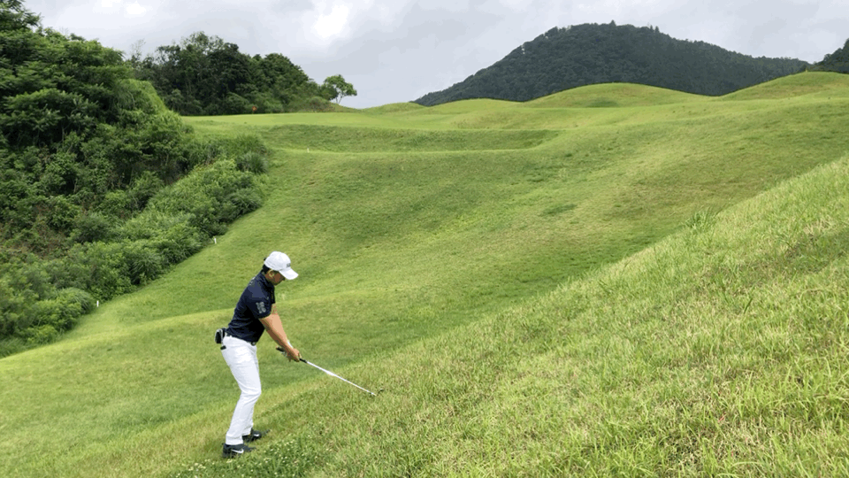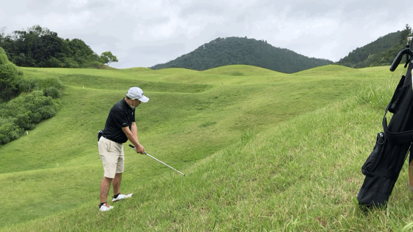 今までだと、手だけで斜面に打ち込むような打ち方をしていましたが、なるべく斜面に逆らわずにアドレスし、体の回転でボールをとらえているのでうまくボールを拾えています。